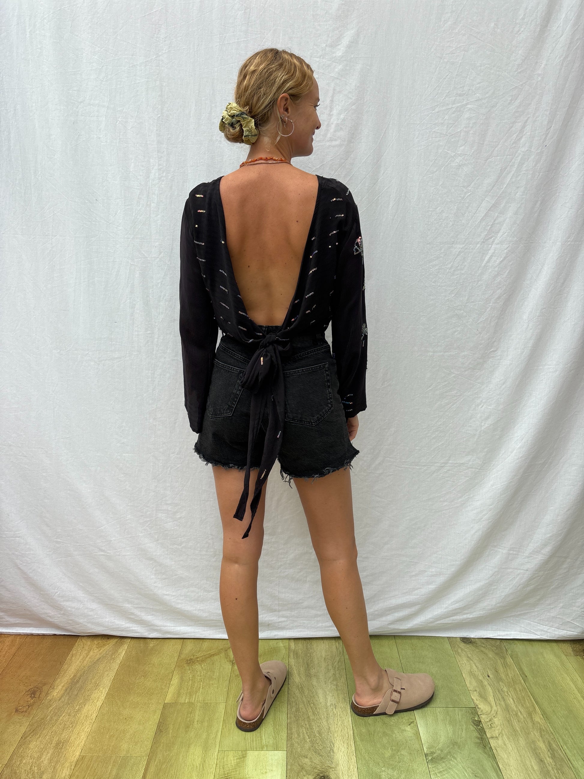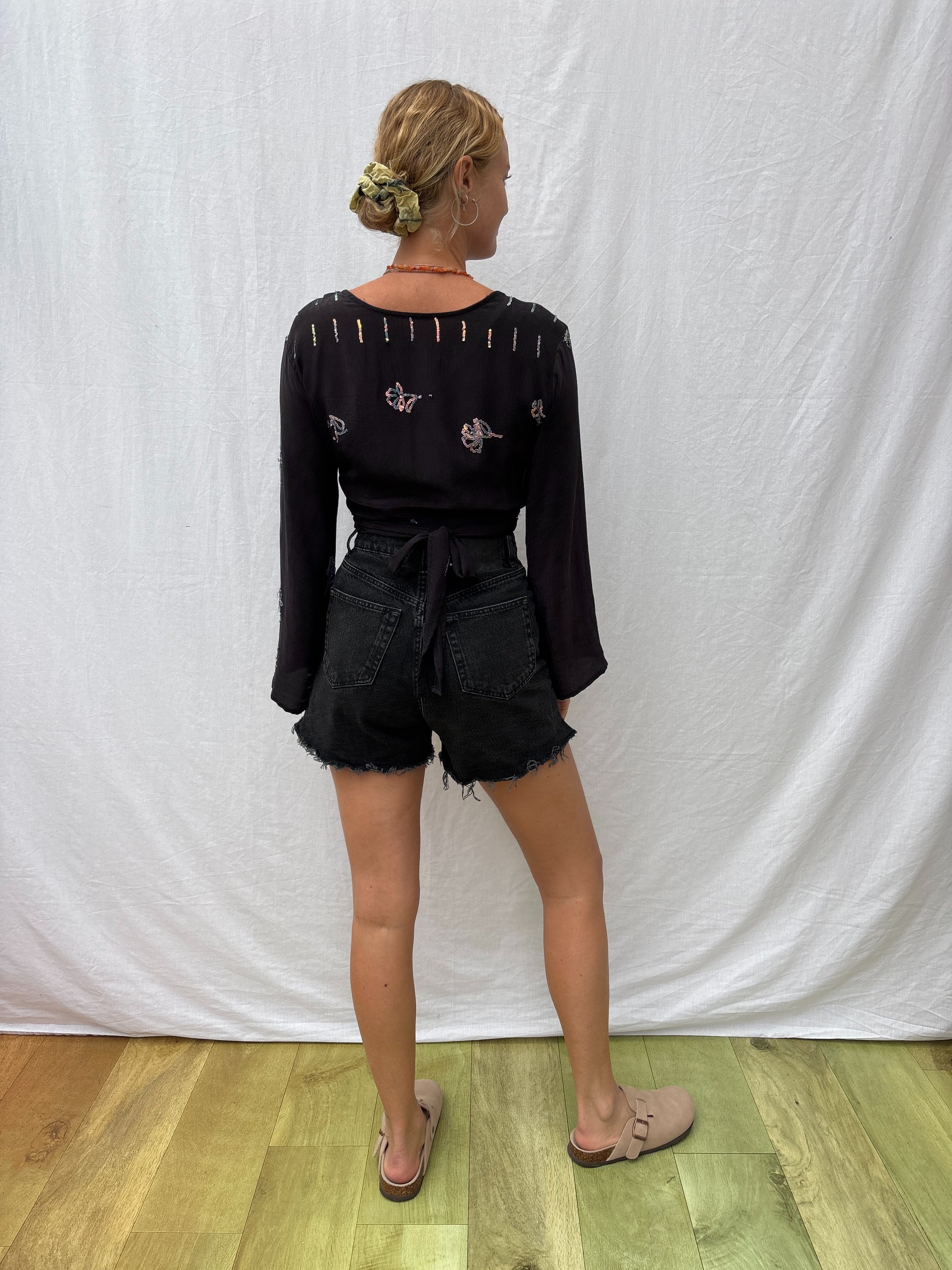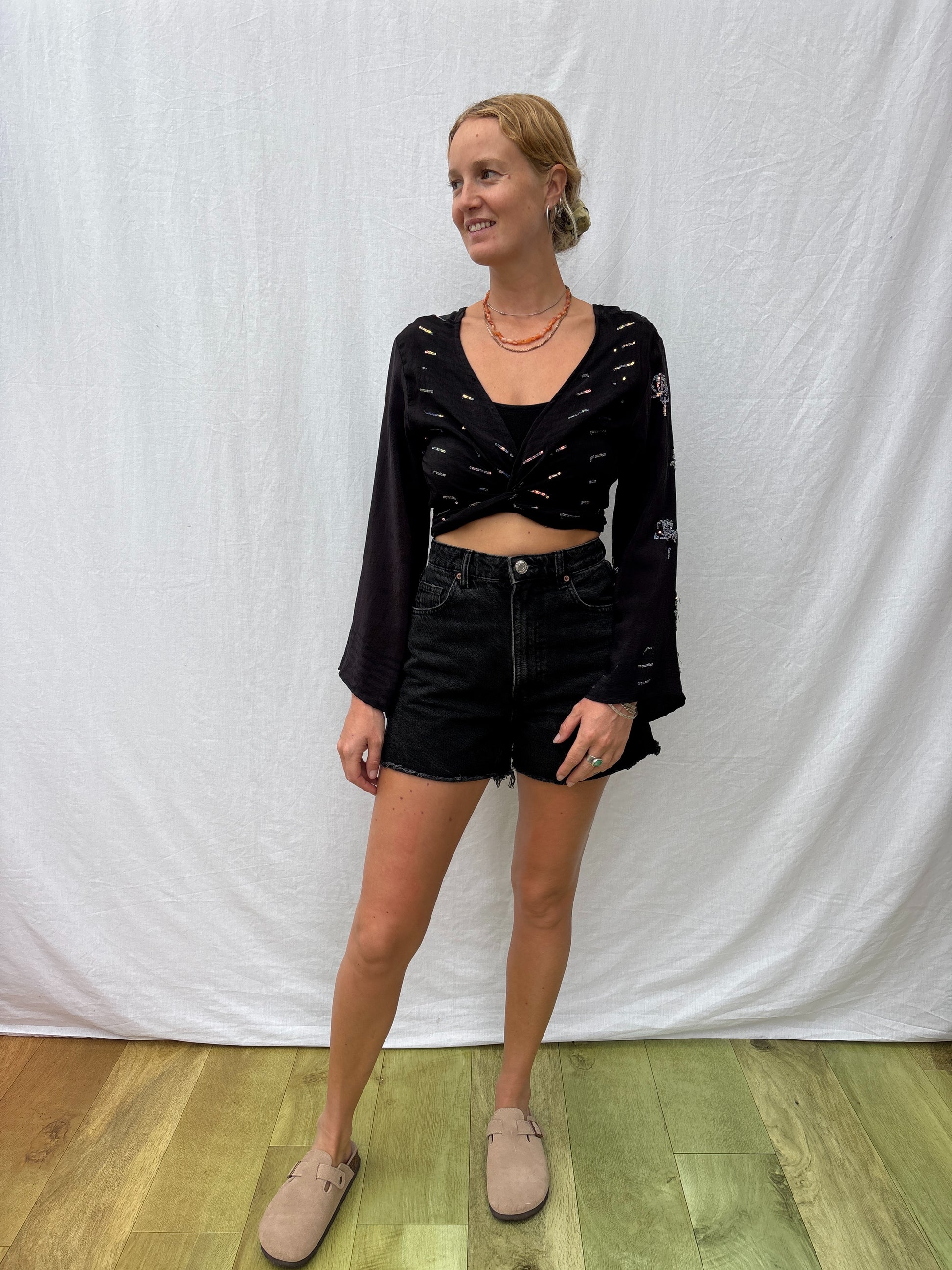 Our 70's inspired tie front top with 3/4 flared sleeves - can be worn at least 6 different ways - tie up, twist, wrap around, wear forwards or backwards.