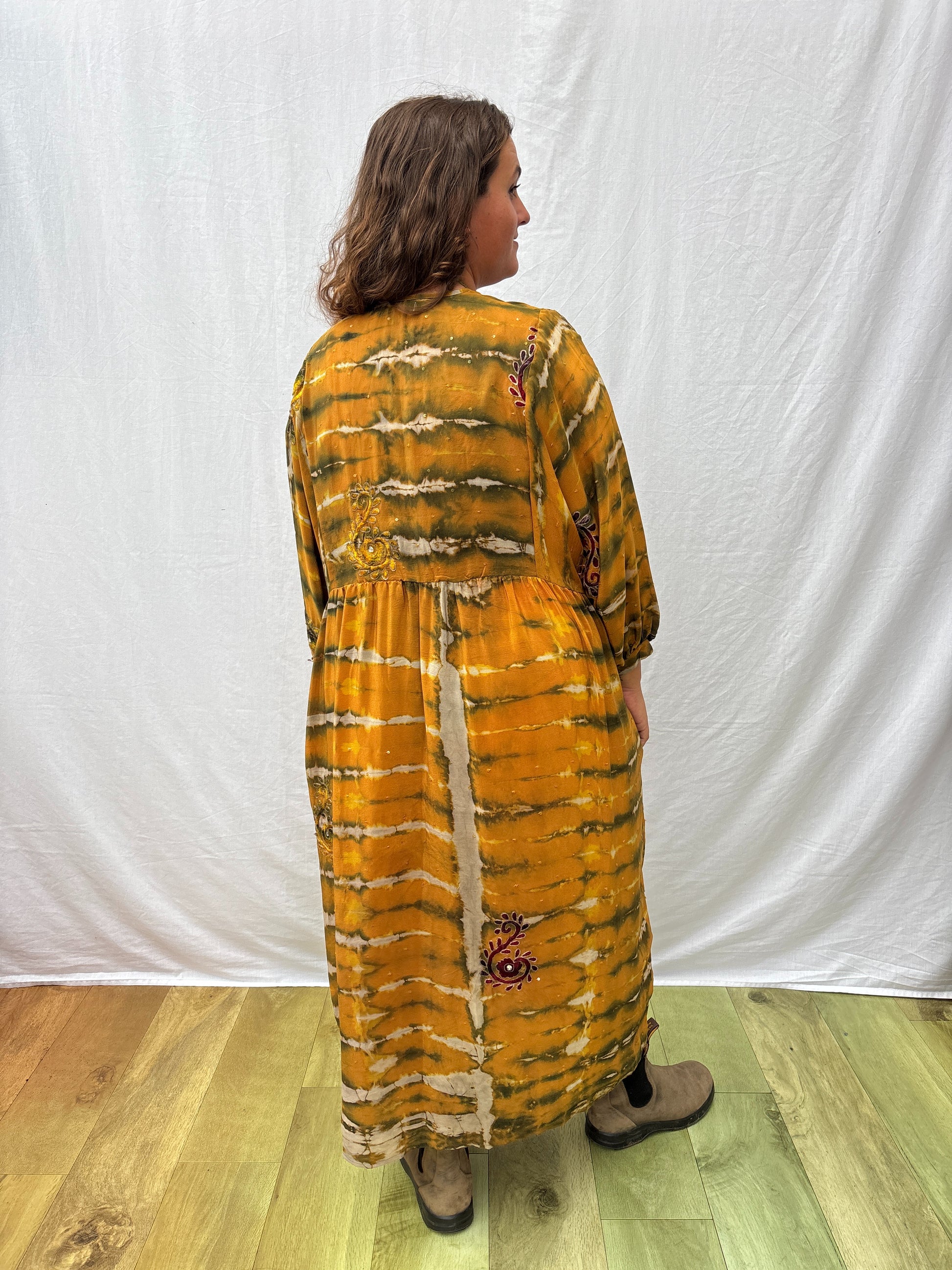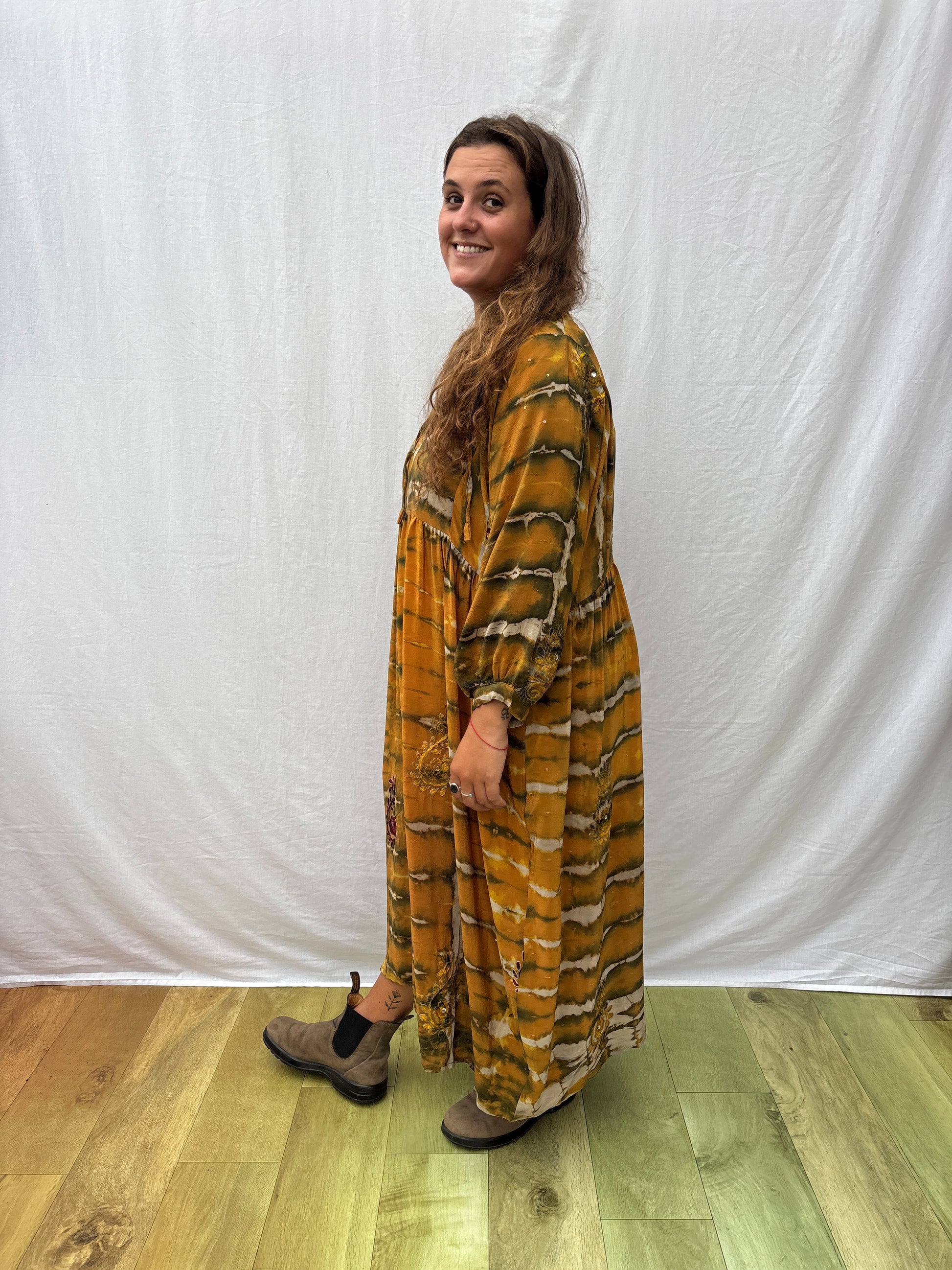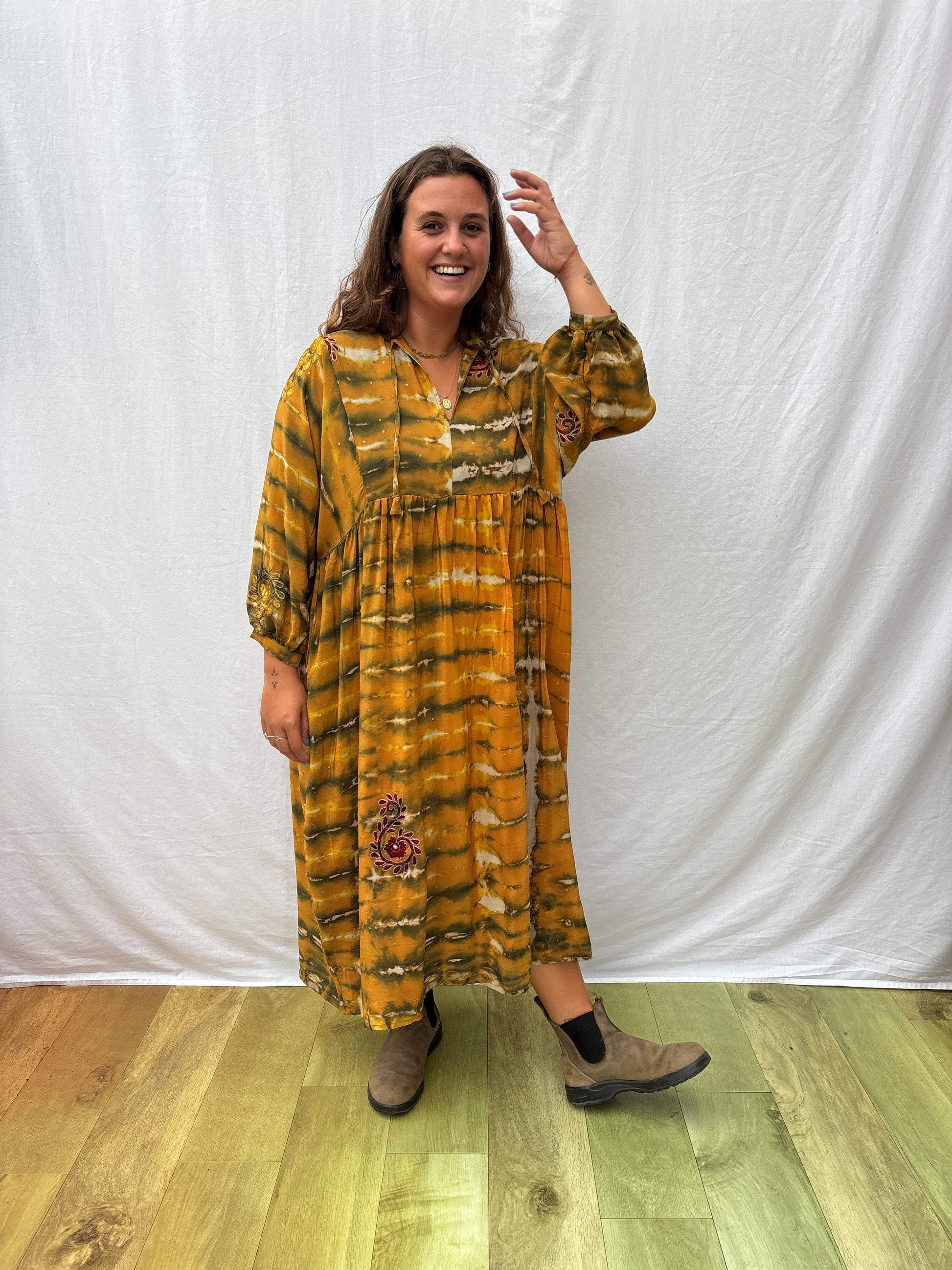 This playful & loose long dress is perfect for everyday wear with its long billowy sleeves and comfortable fit.