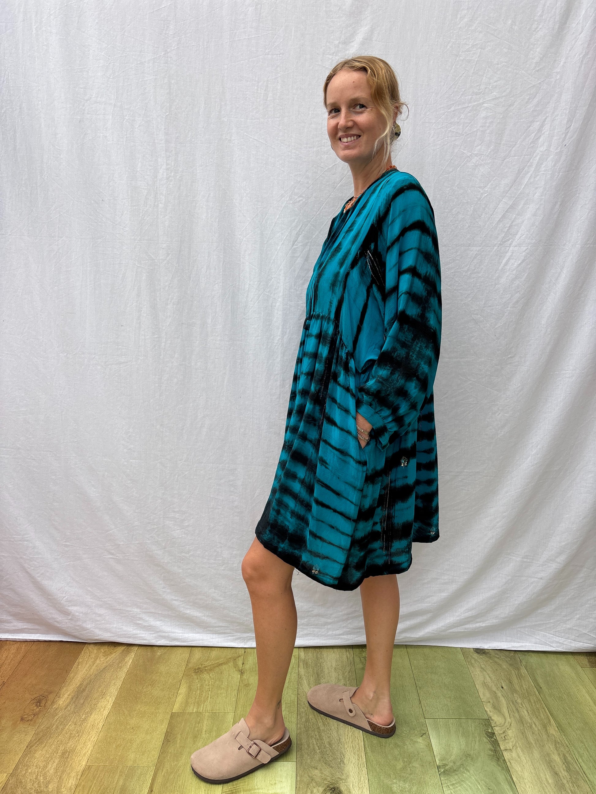 This playful & loose dress is perfect for everyday wear with its long billowy sleeves and comfortable fit.