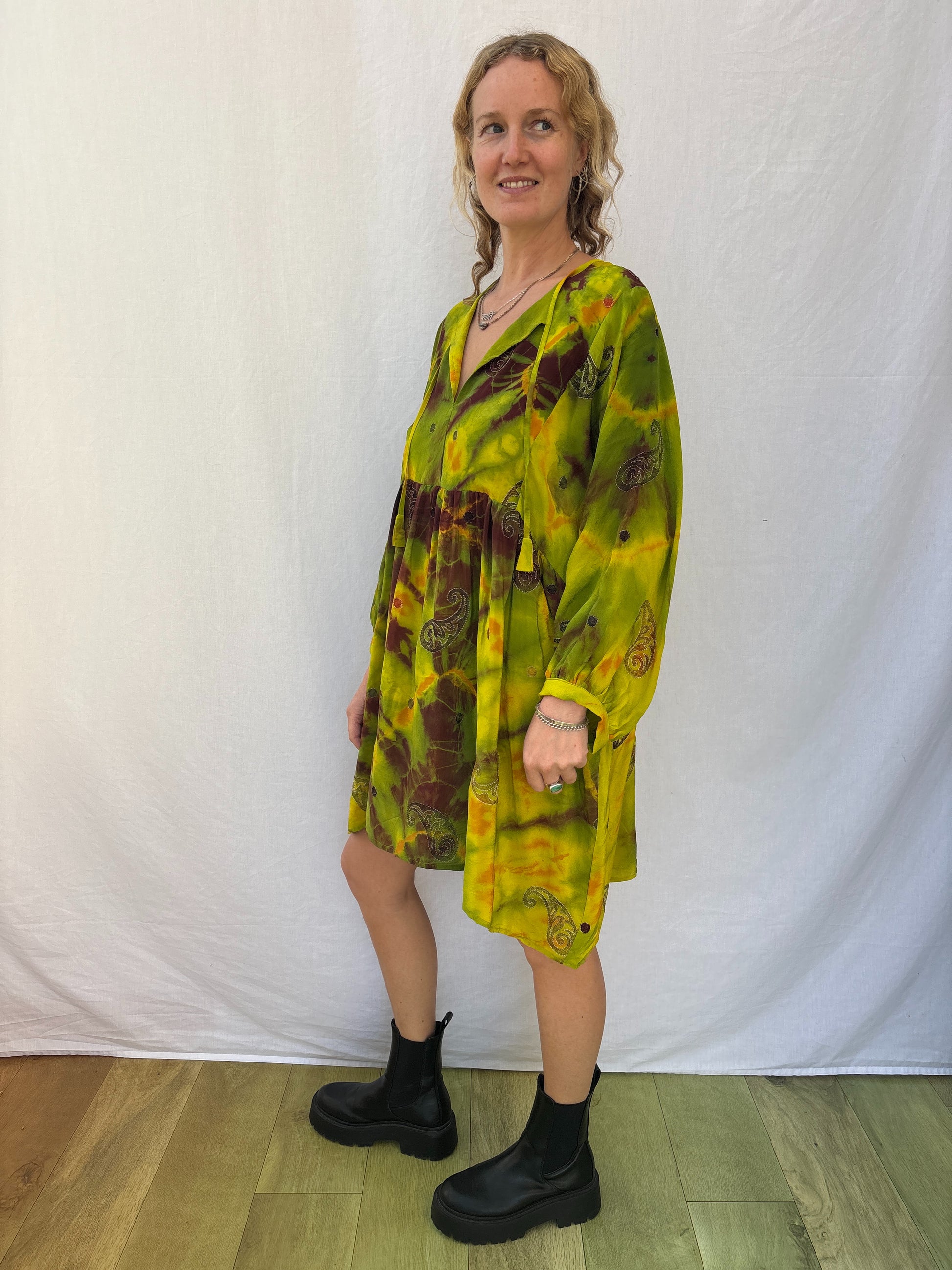 This playful & loose dress is perfect for everyday wear with its long billowy sleeves and comfortable fit.