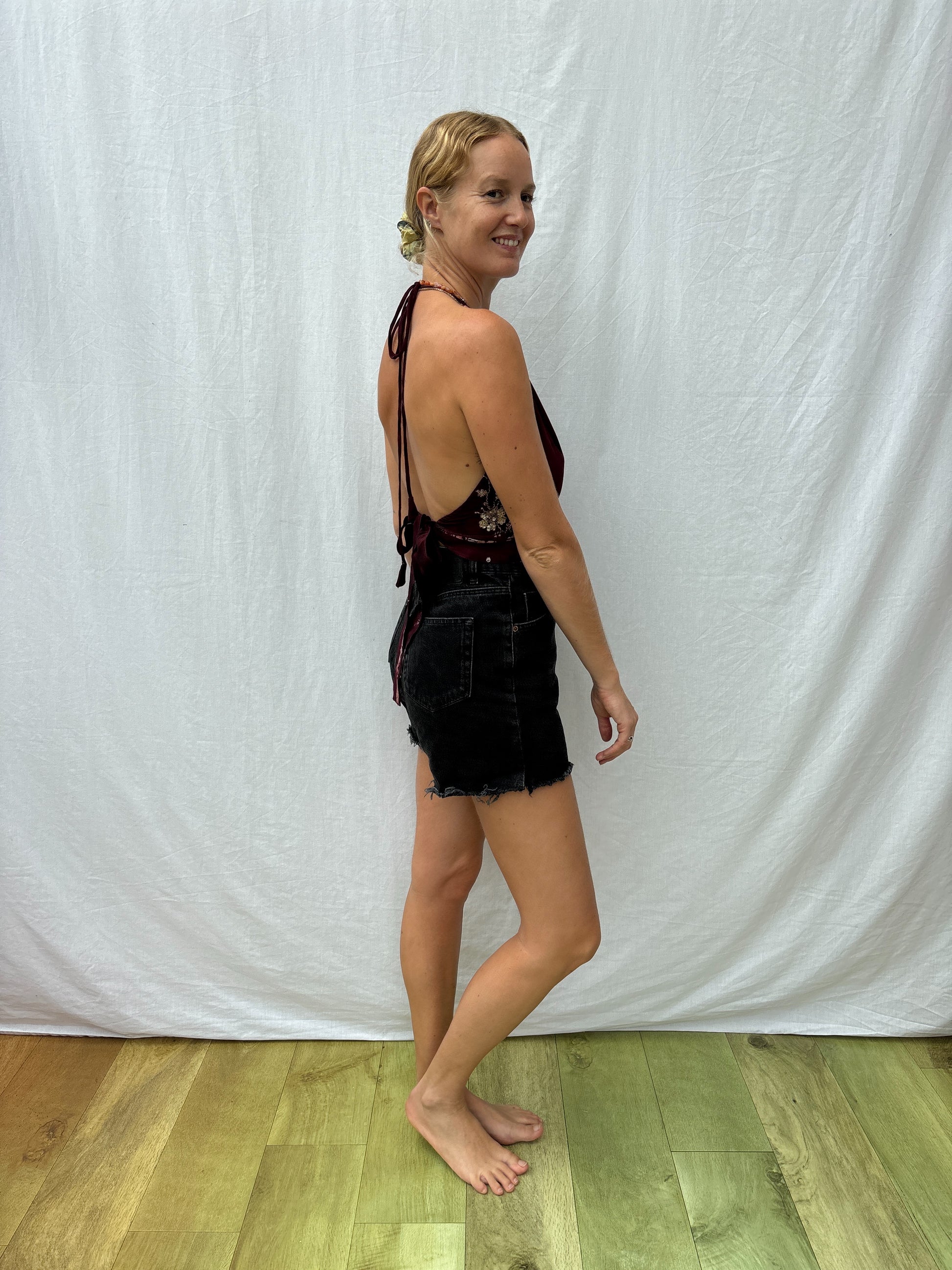 Made to show off sun kissed shoulders and sexy backs, this silk halter neck top is a little summer must have. Cropped length with wrap around back tie, plus an adjustable ruched neck that ties up to suit you.