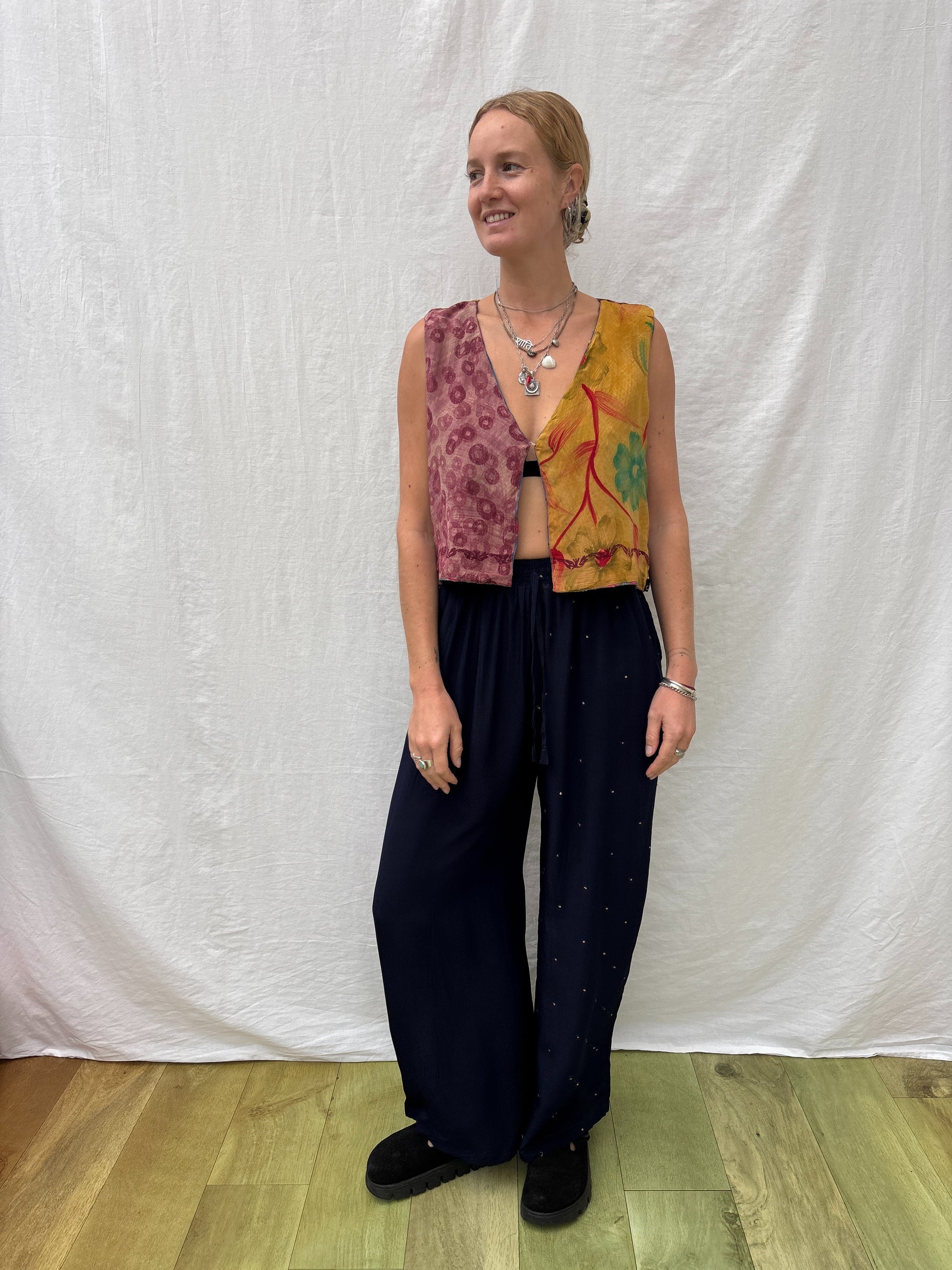 Double the fun with this reversible silk waistcoat vest top. Feminine fit with a deep V neckline, perfect for layering or wear it sexy style, just clasped at the bust.