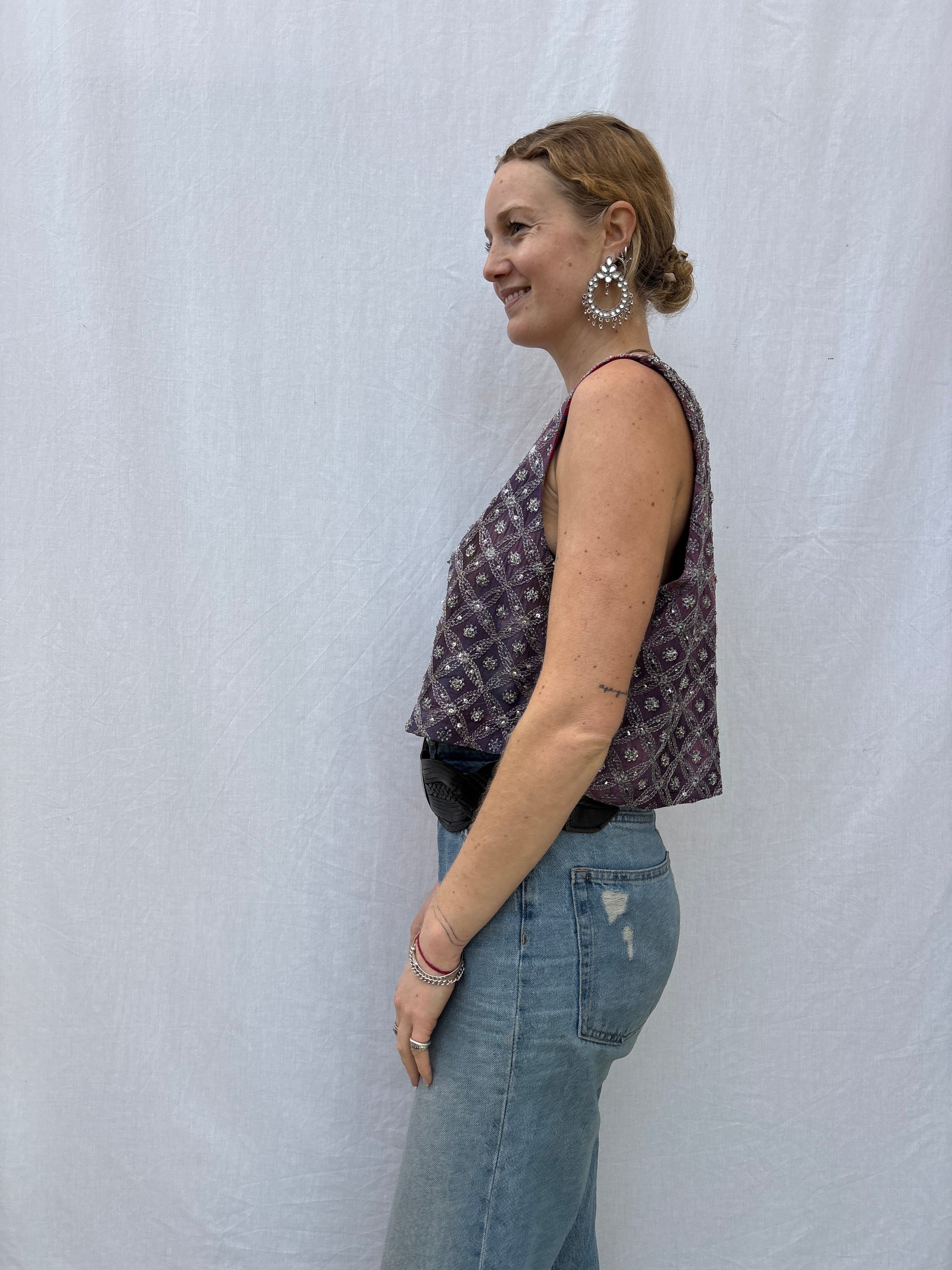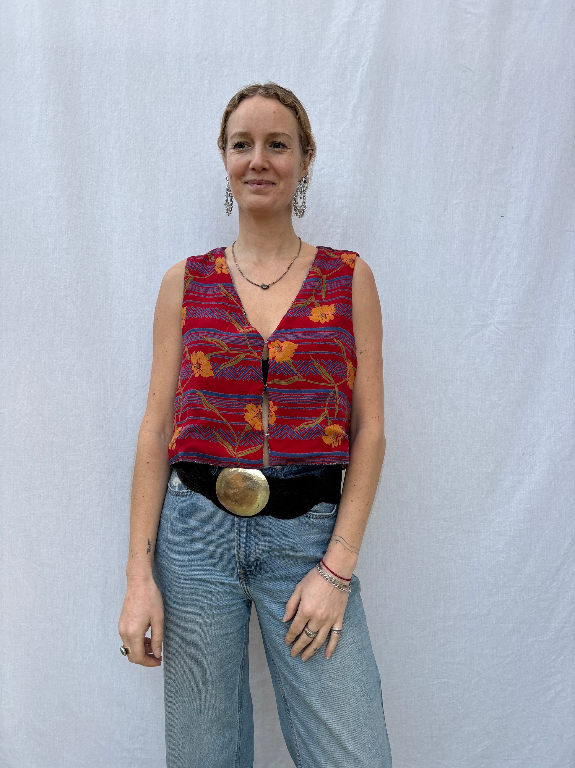 Double the fun with this reversible silk waistcoat vest top. Feminine fit with a deep V neckline, perfect for layering or wear it sexy style, just clasped at the bust.