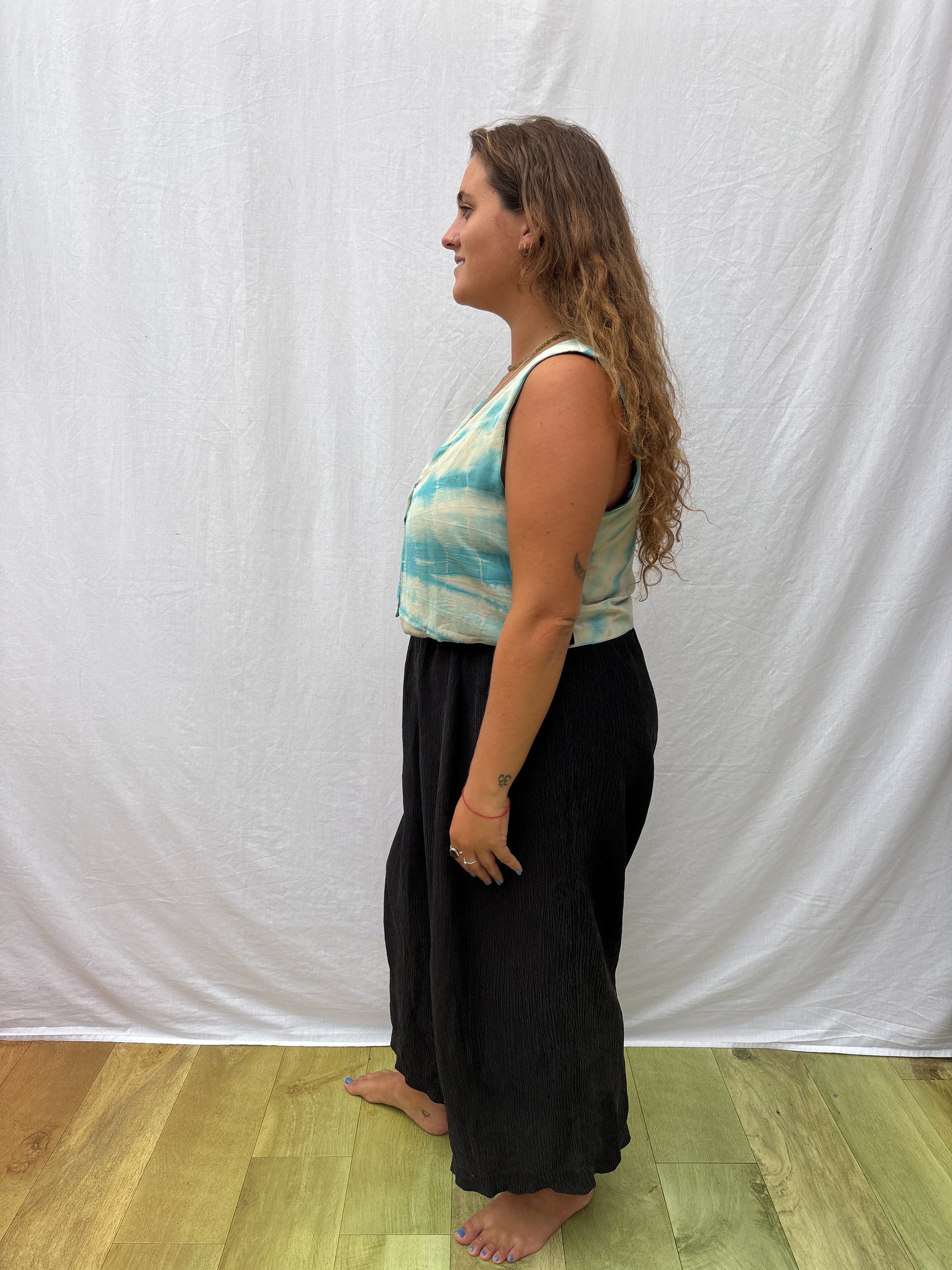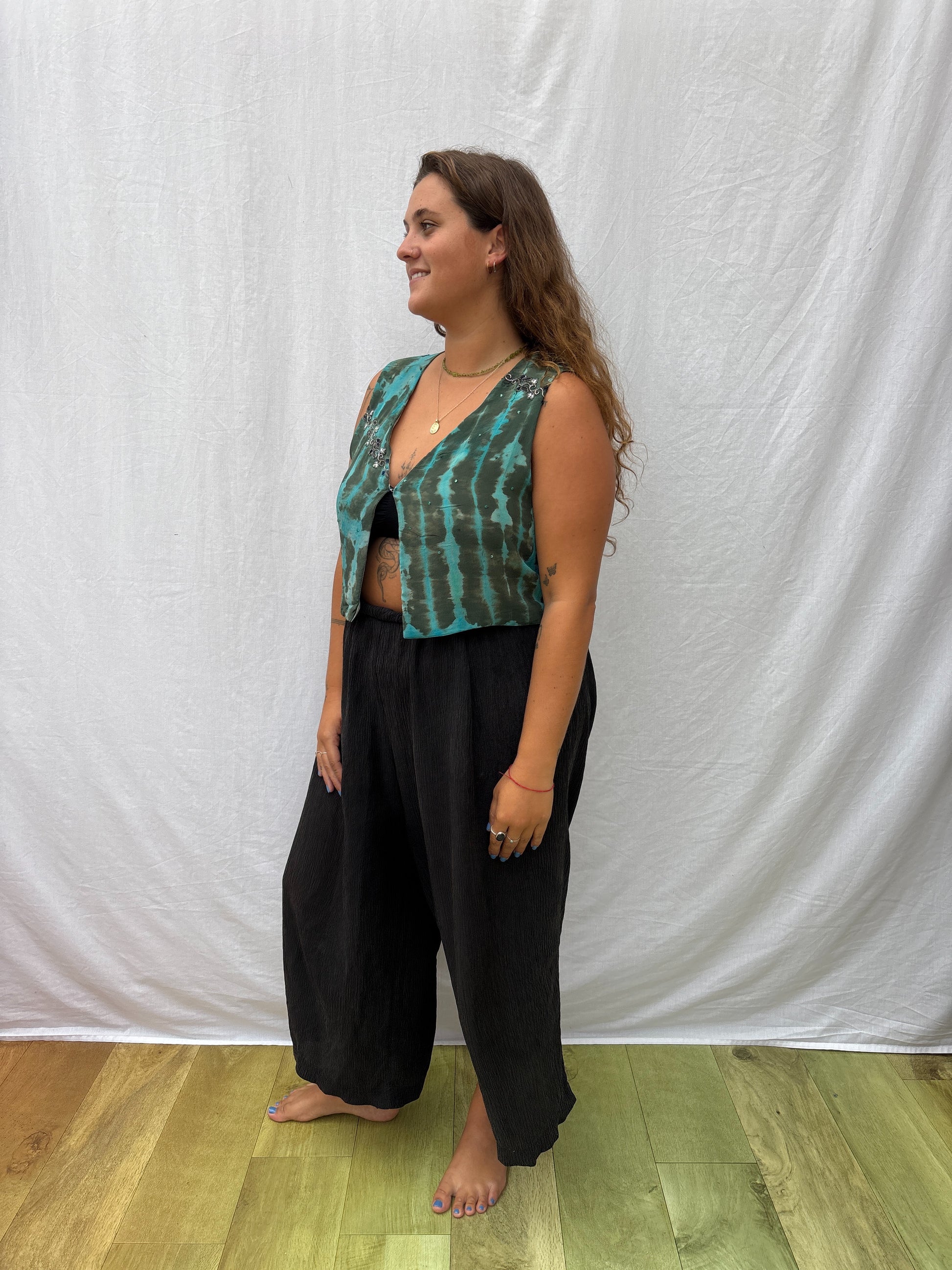 Double the fun with this reversible silk waistcoat vest top. Feminine fit with a deep V neckline, perfect for layering or wear it sexy style, just clasped at the bust.