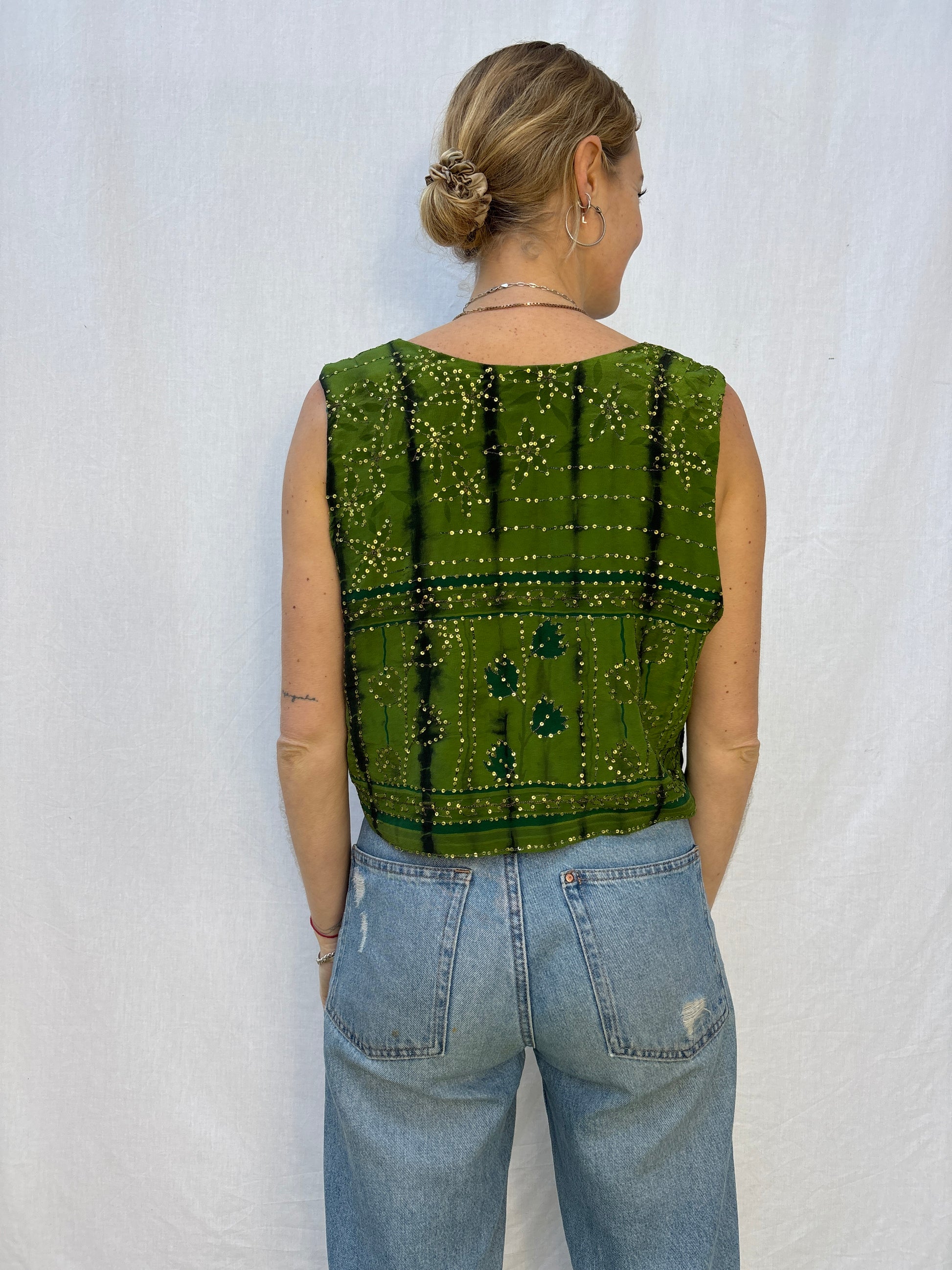 Double the fun with this reversible silk waistcoat vest top. Feminine fit with a deep V neckline, perfect for layering or wear it sexy style, just clasped at the bust.