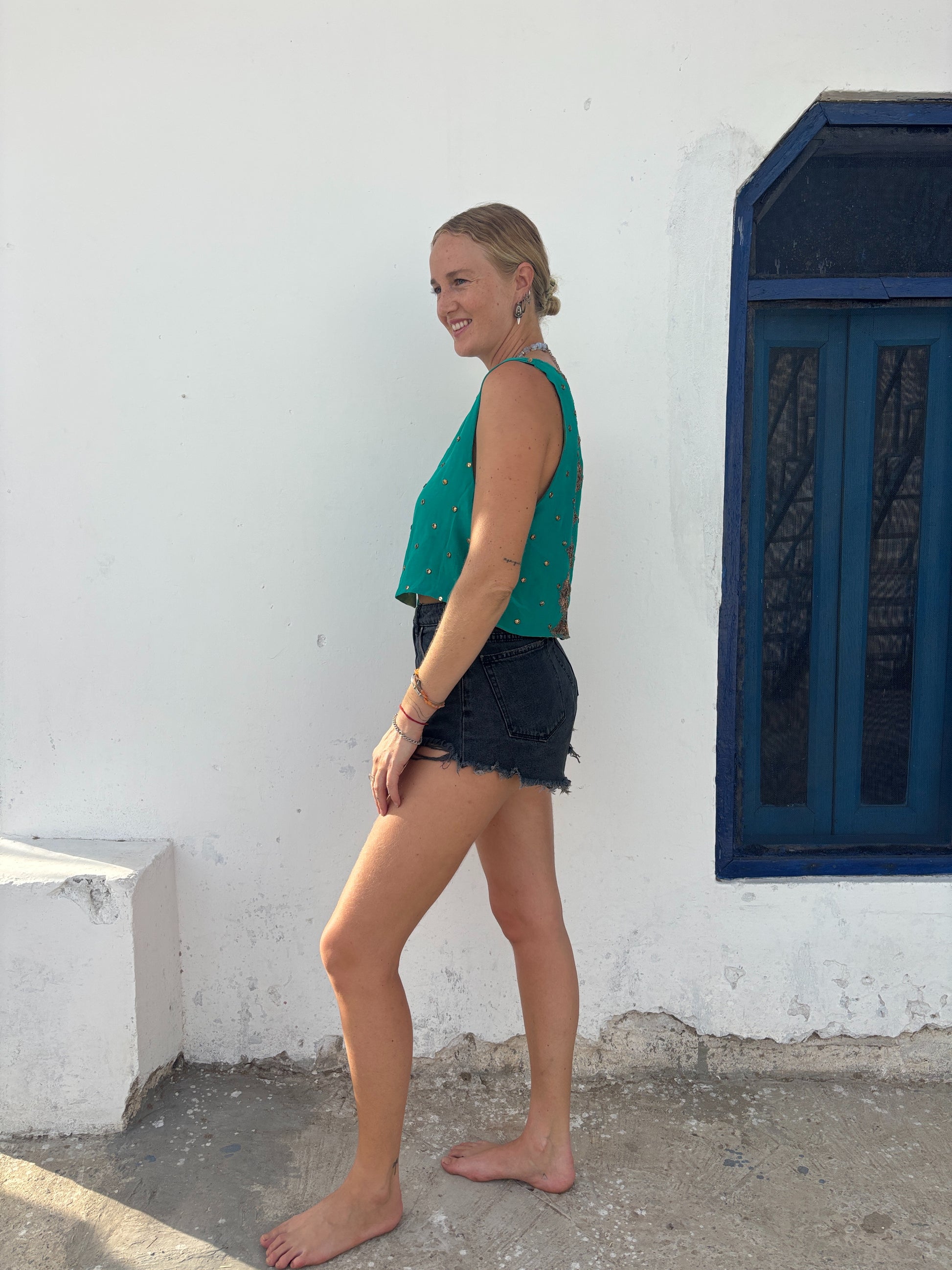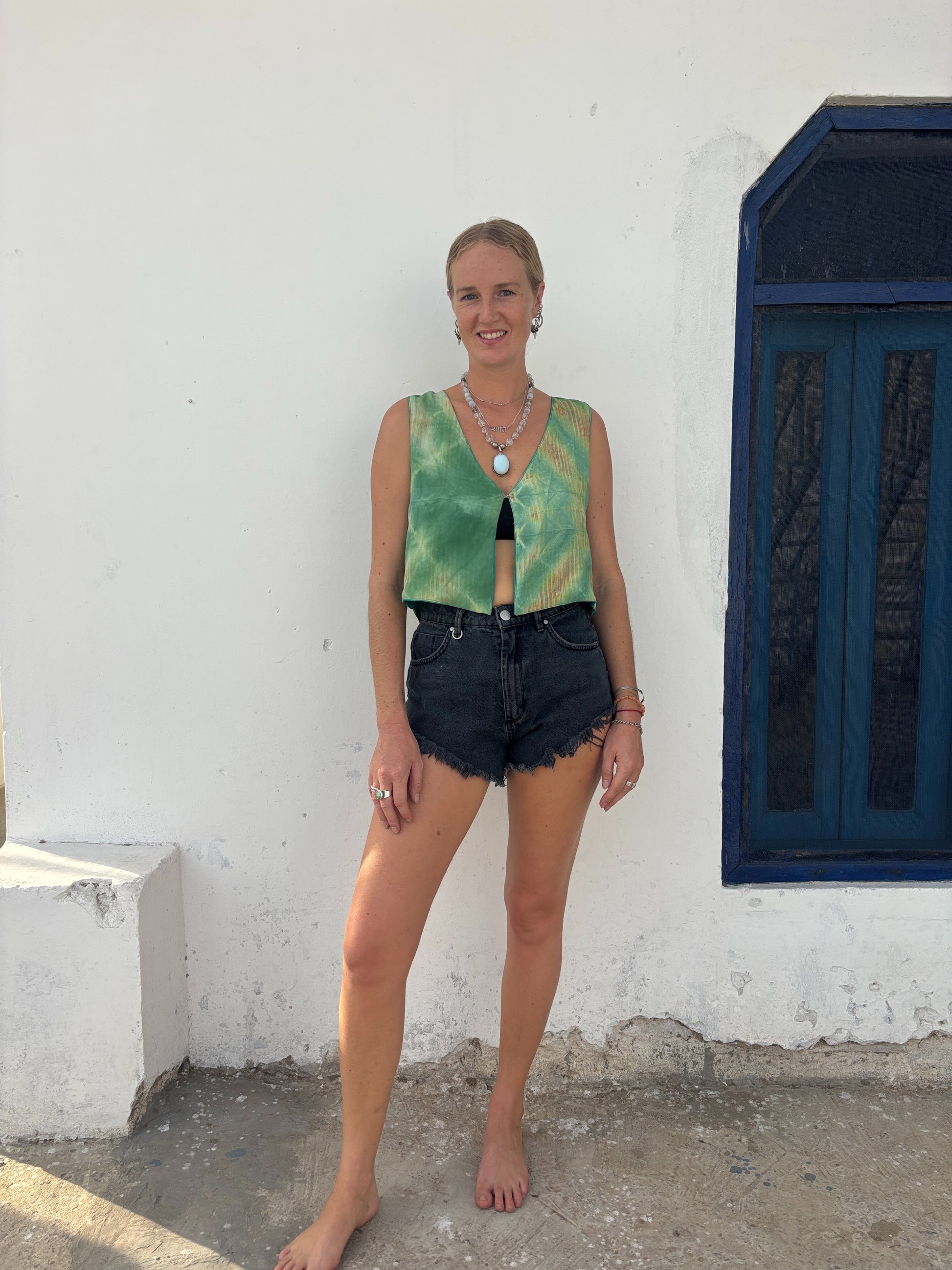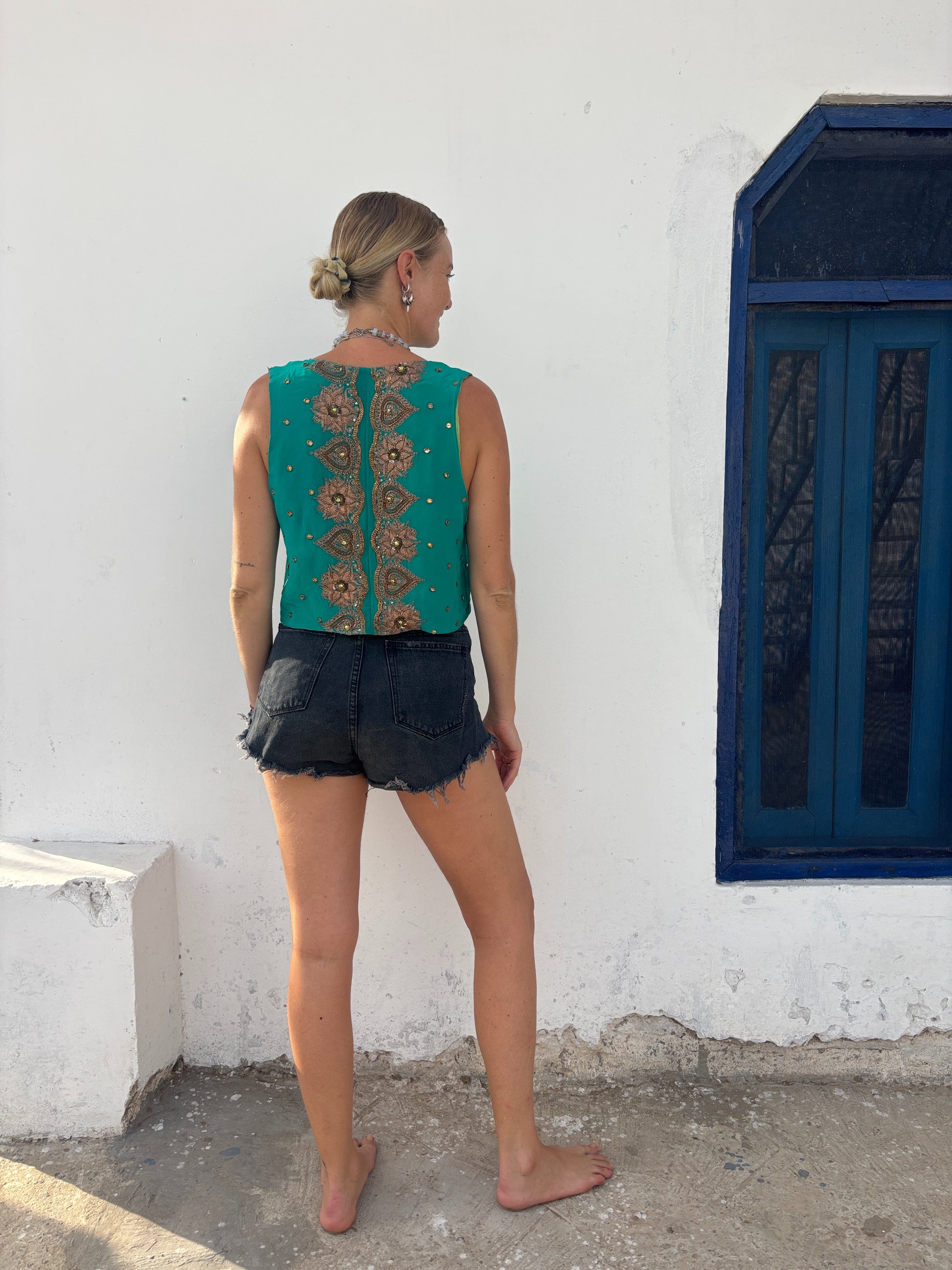 Double the fun with this reversible silk waistcoat vest top. Feminine fit with a deep V neckline, perfect for layering or wear it sexy style, just clasped at the bust.