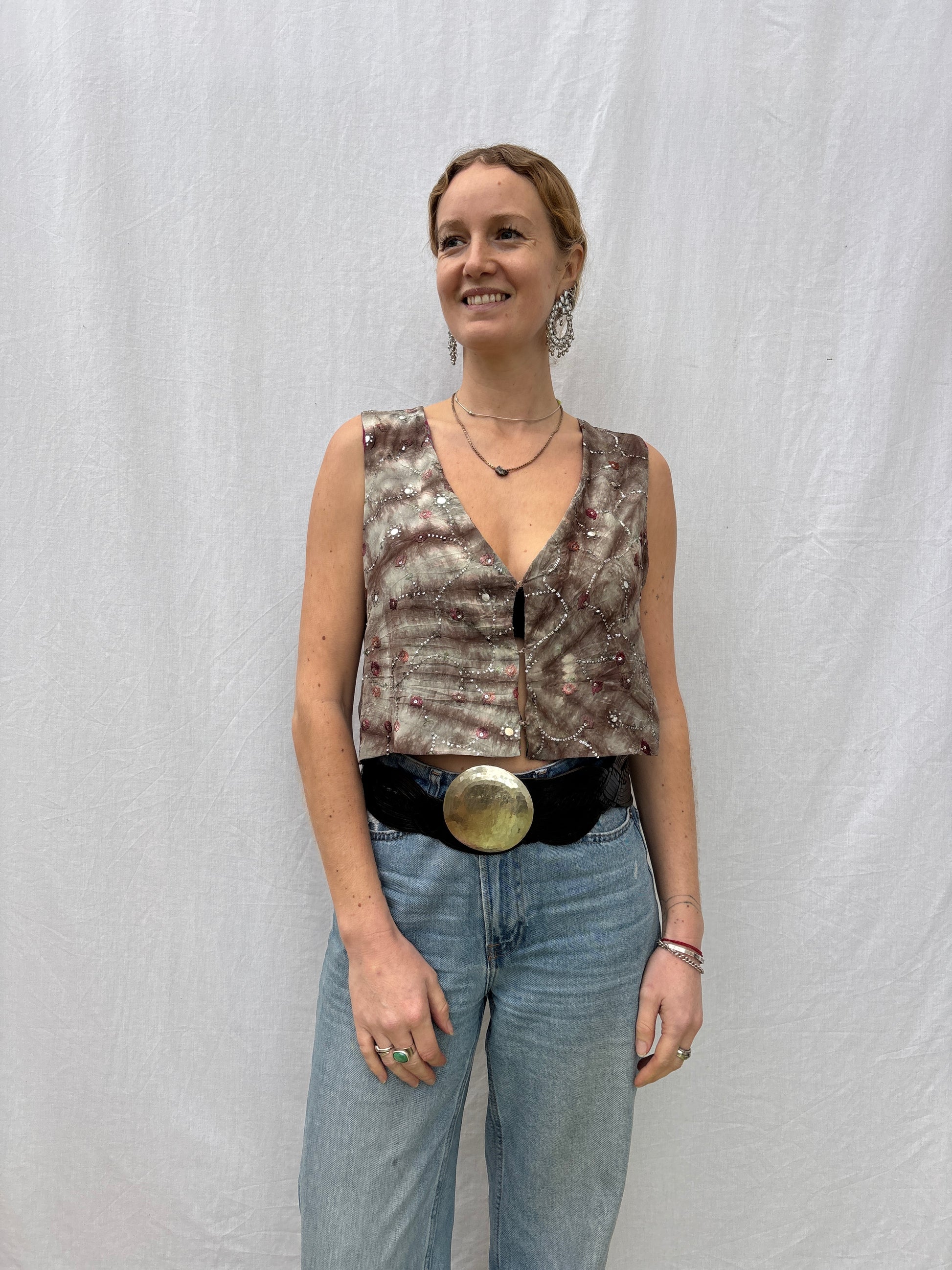 Double the fun with this reversible silk waistcoat vest top. Feminine fit with a deep V neckline, perfect for layering or wear it sexy style, just clasped at the bust.
