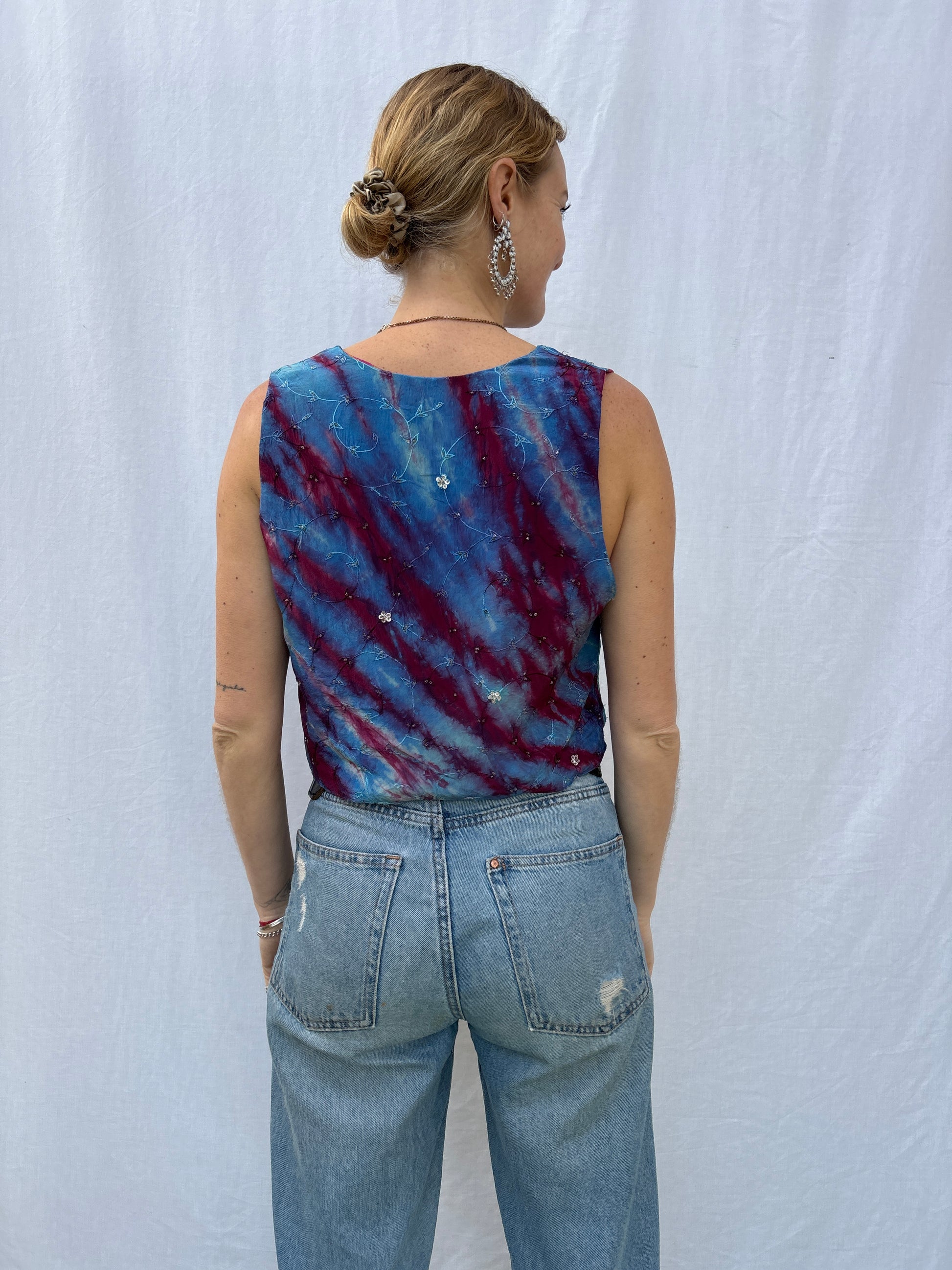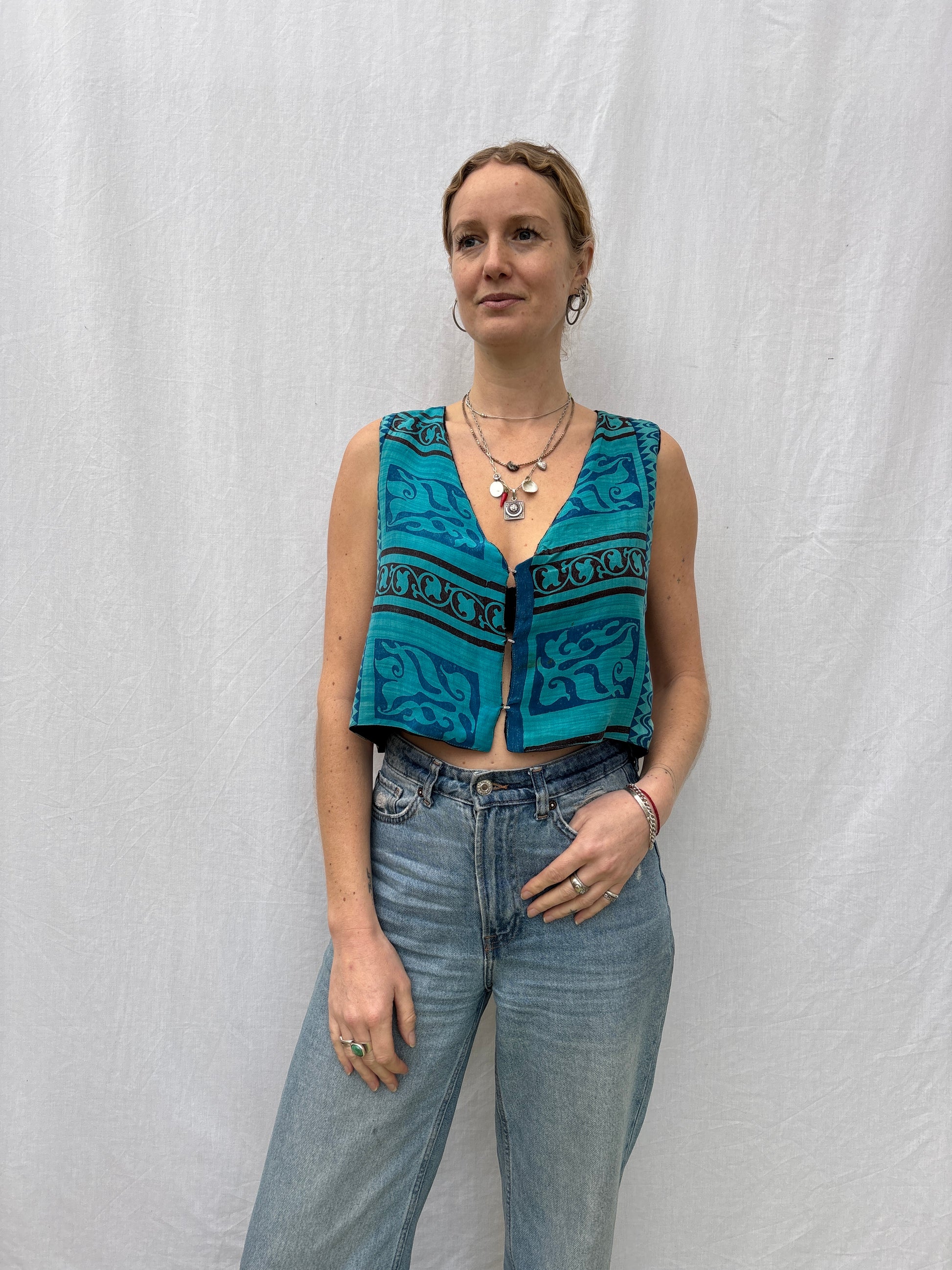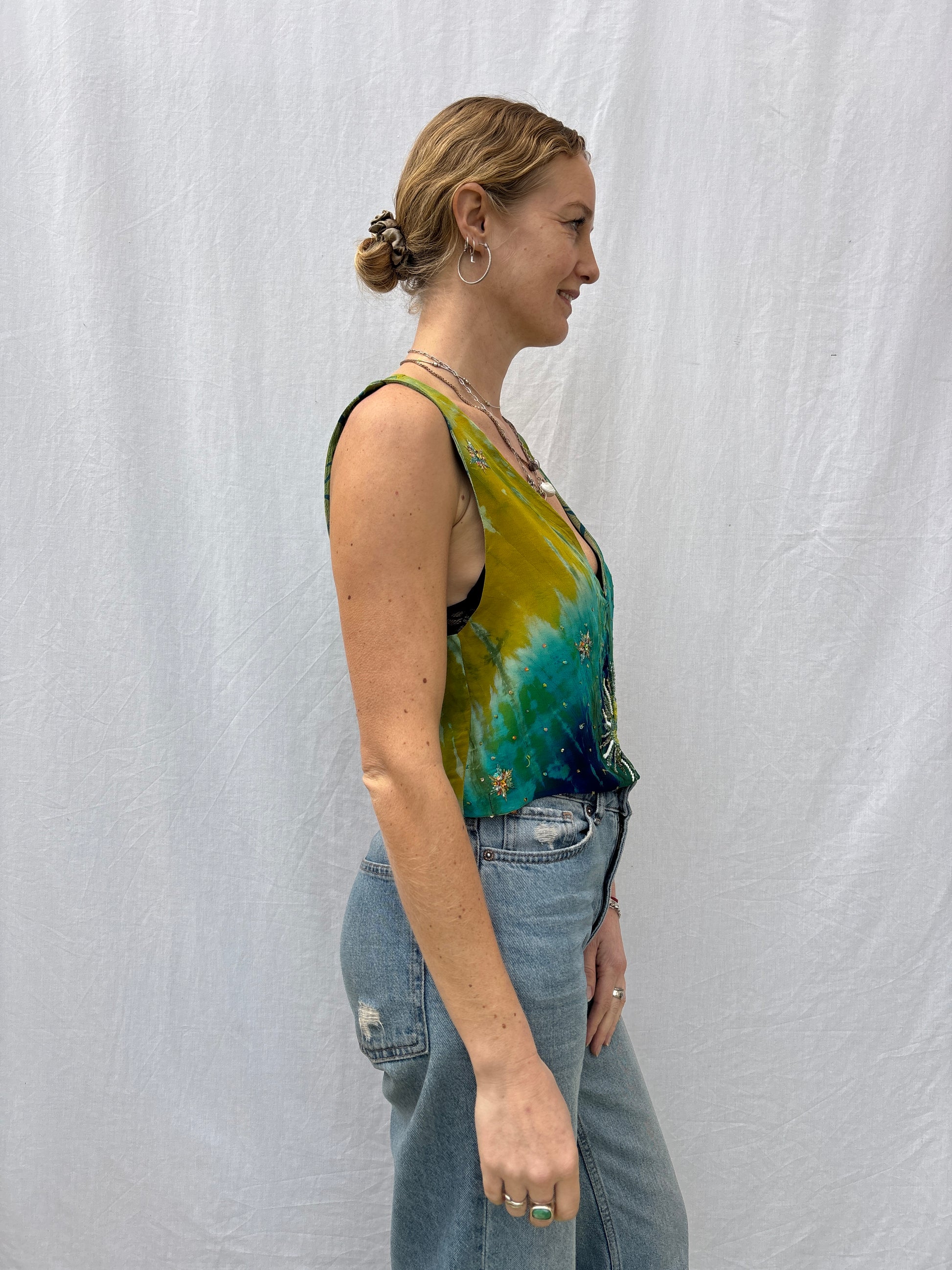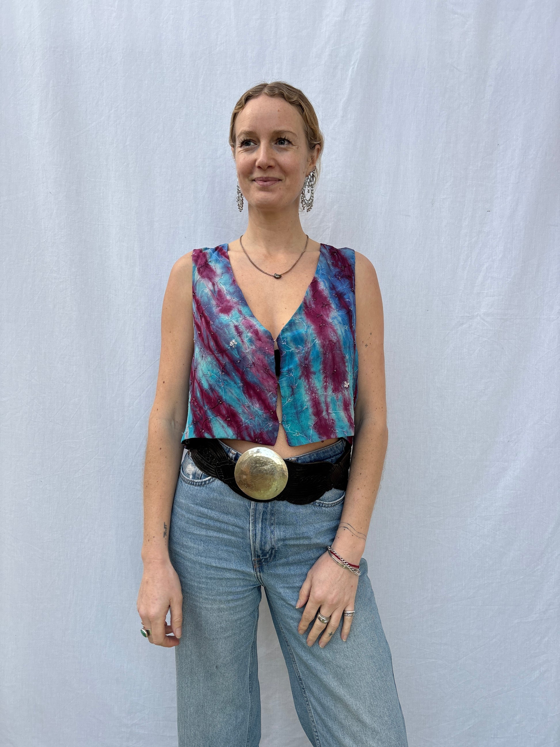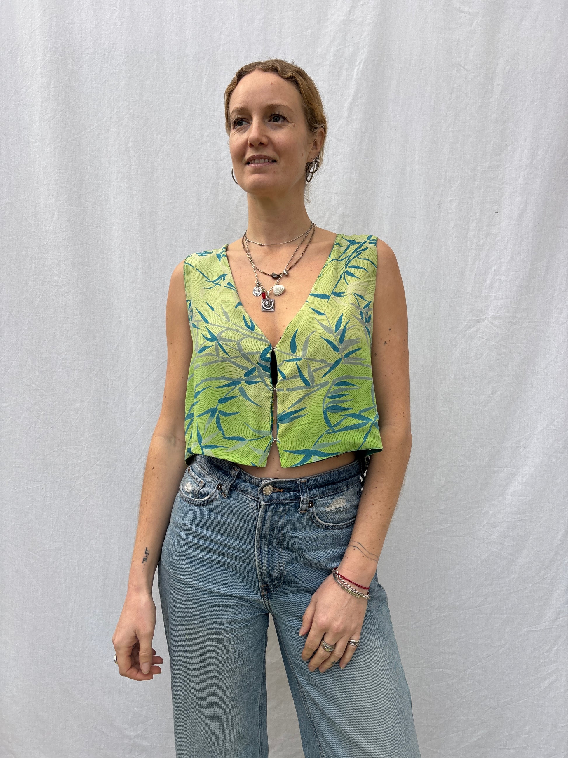 Double the fun with this reversible silk waistcoat vest top. Feminine fit with a deep V neckline, perfect for layering or wear it sexy style, just clasped at the bust.