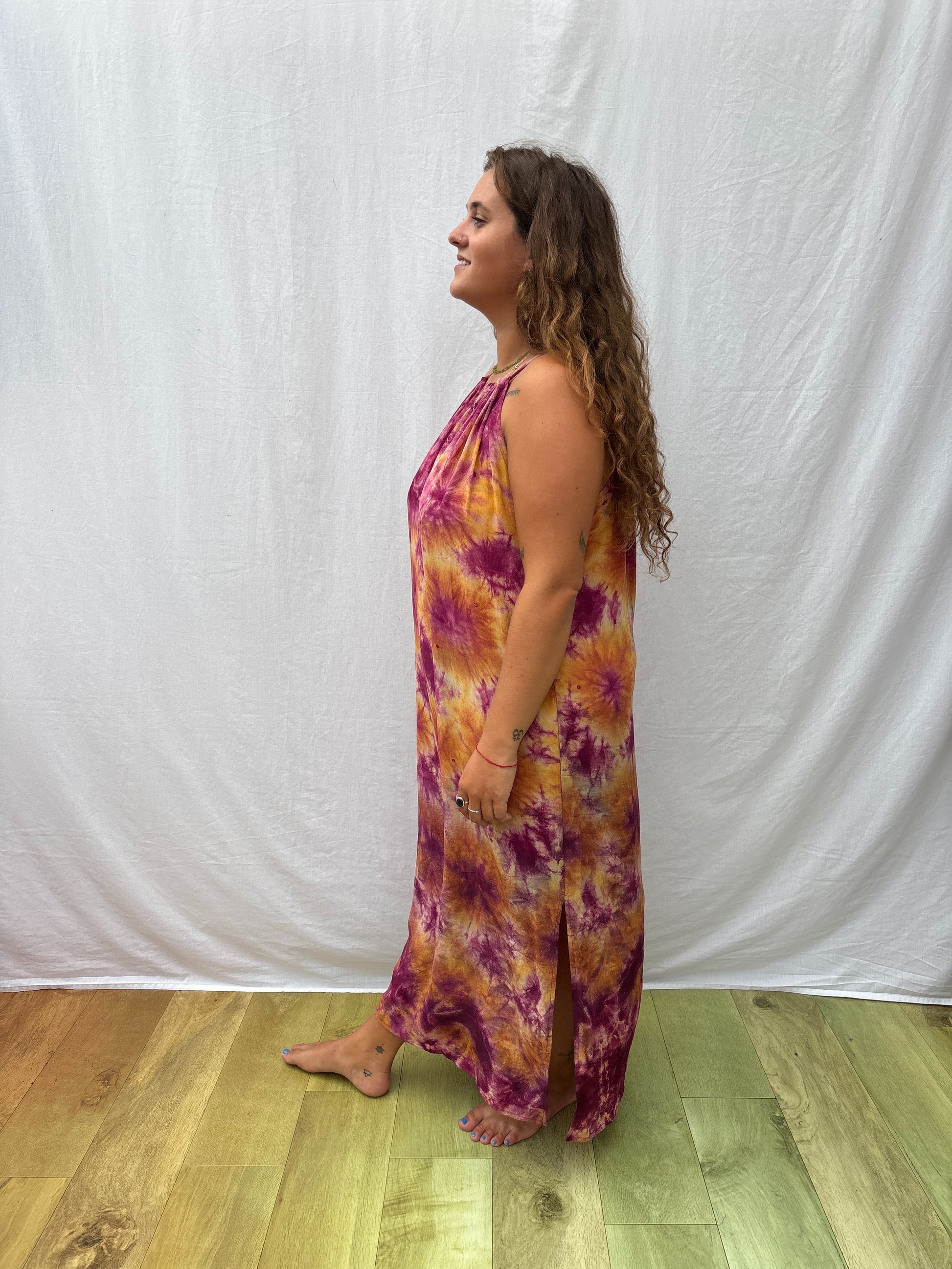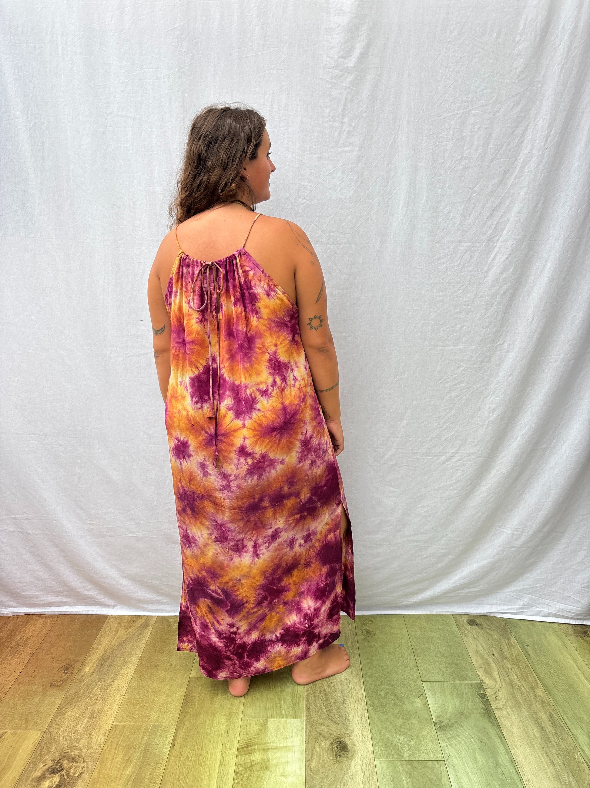 This maxi sun dress is the perfect holiday or sunny day dress. Adjustable straps mean you can choose the length and neckline, whilst the boxy shape & side split keeps it cool and airy.