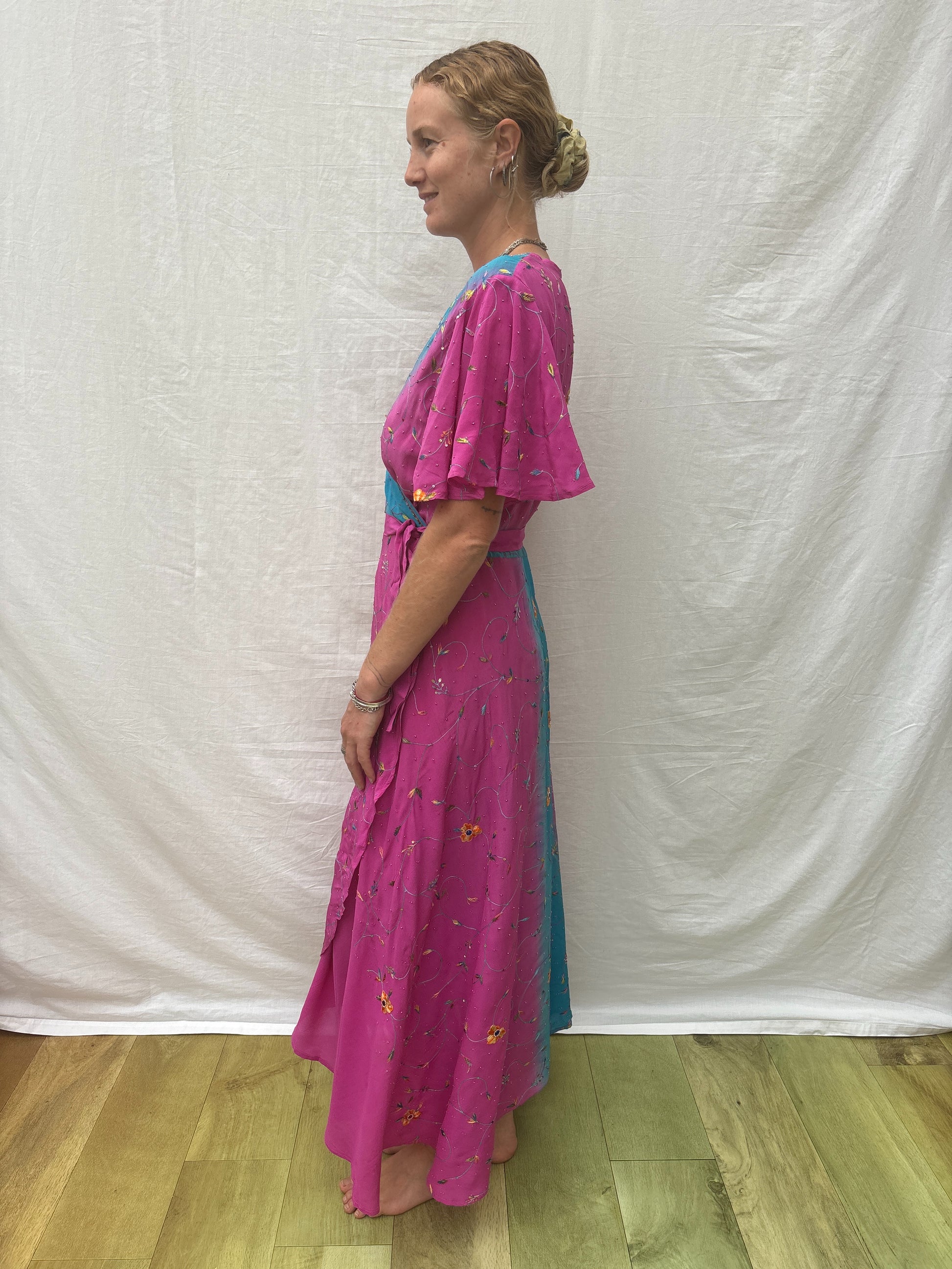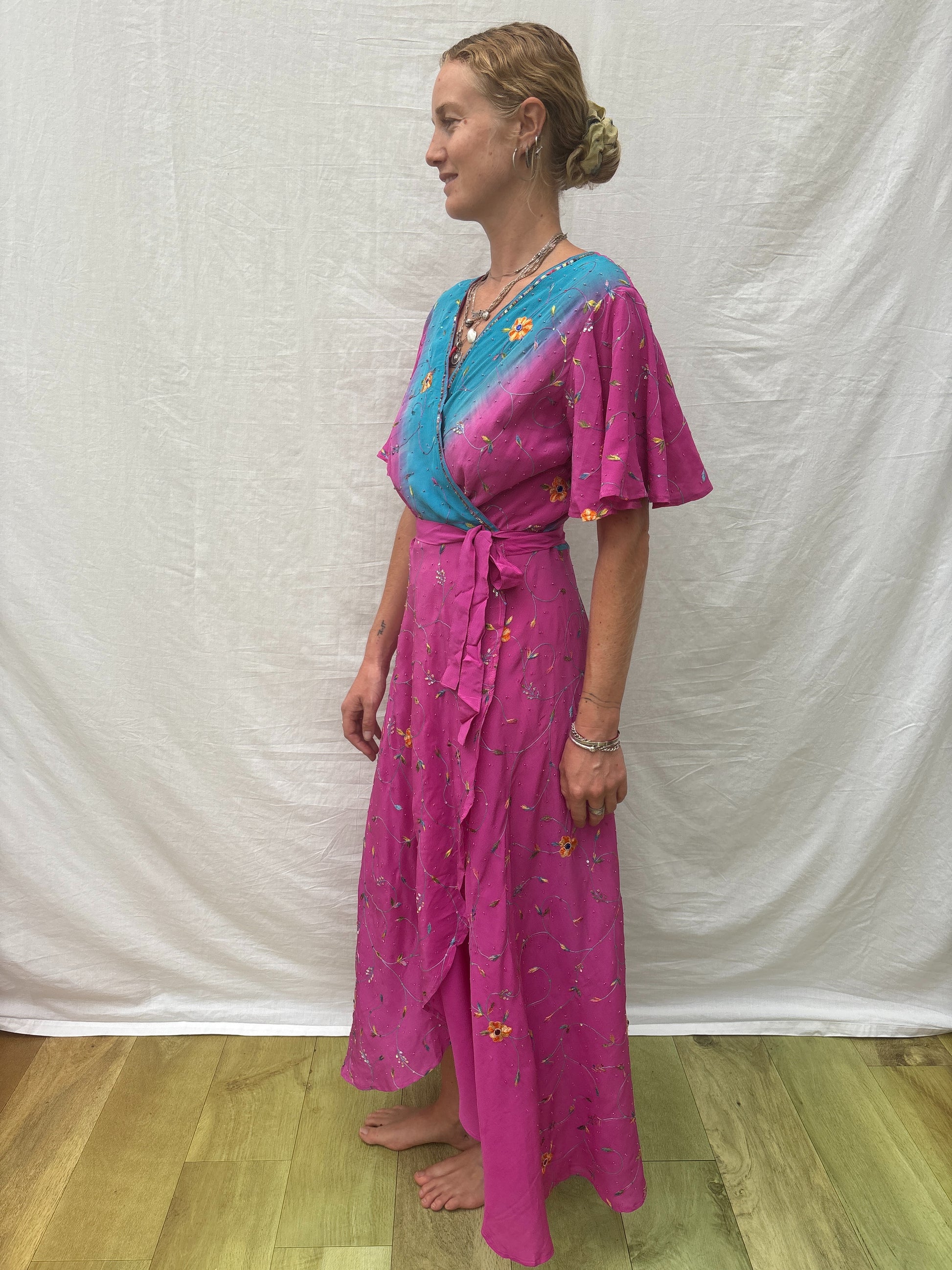 This silk maxi wrap dress is the most flattering & flowy shape for every body. She really makes you swan around and wants to be worn to weddings, on dinner dates, on sunny days & beach nights.